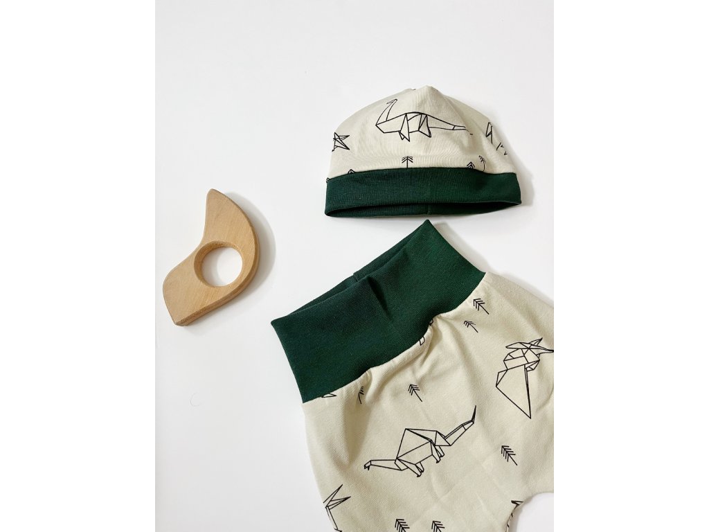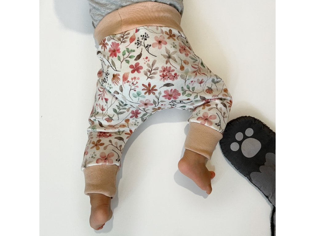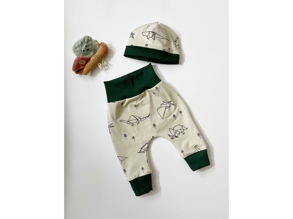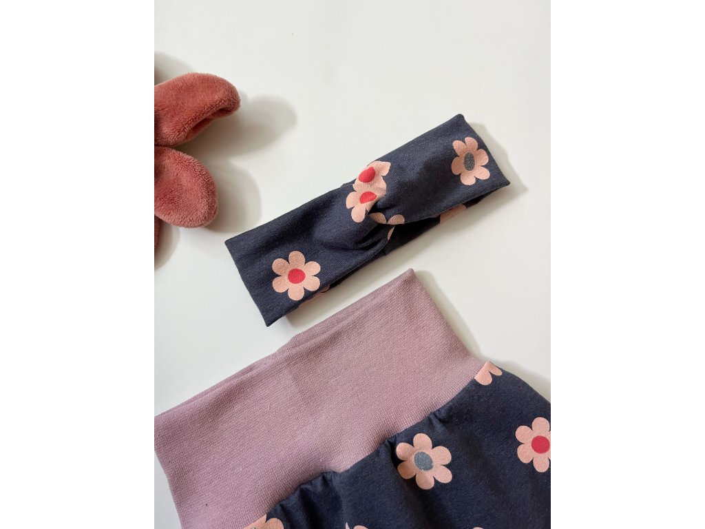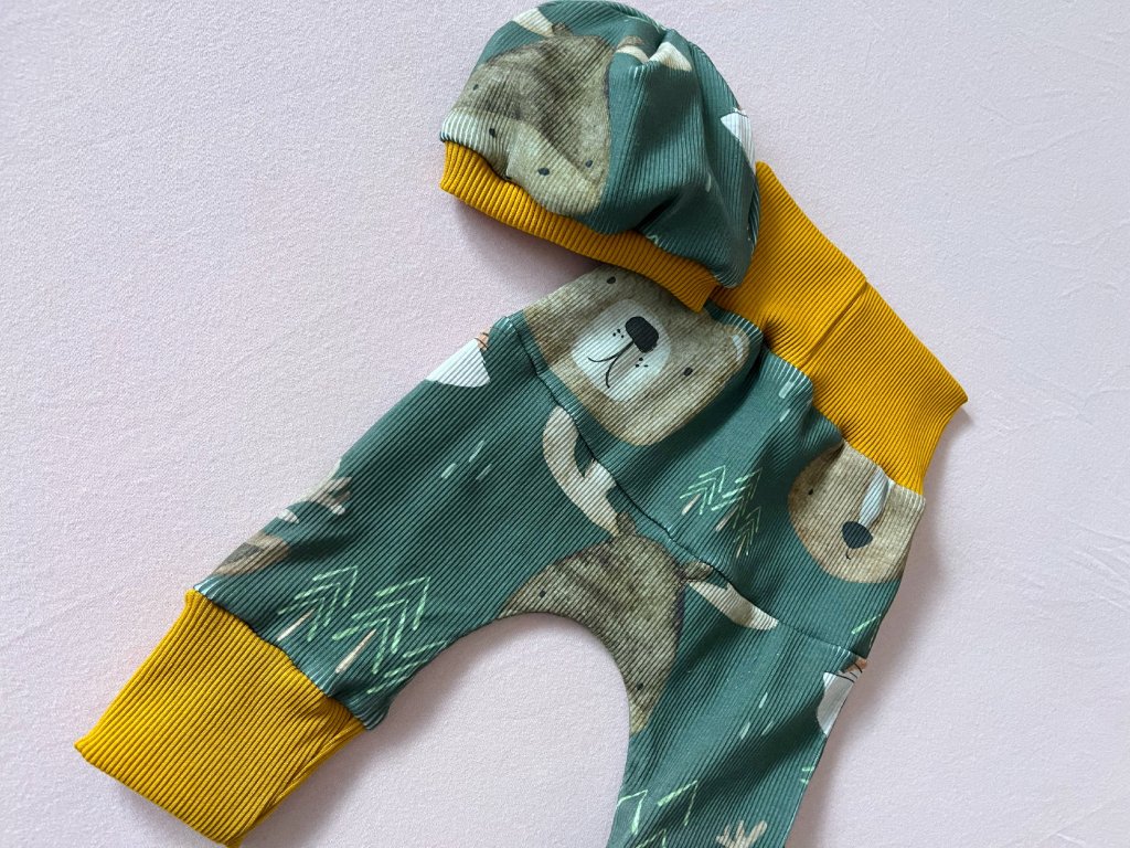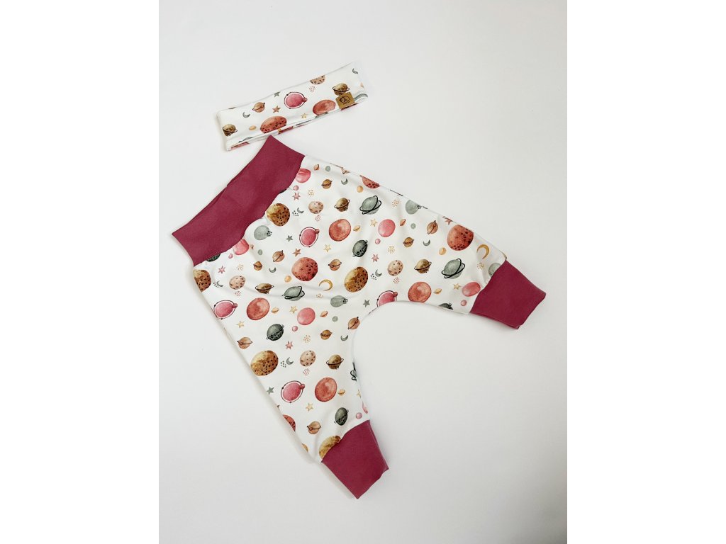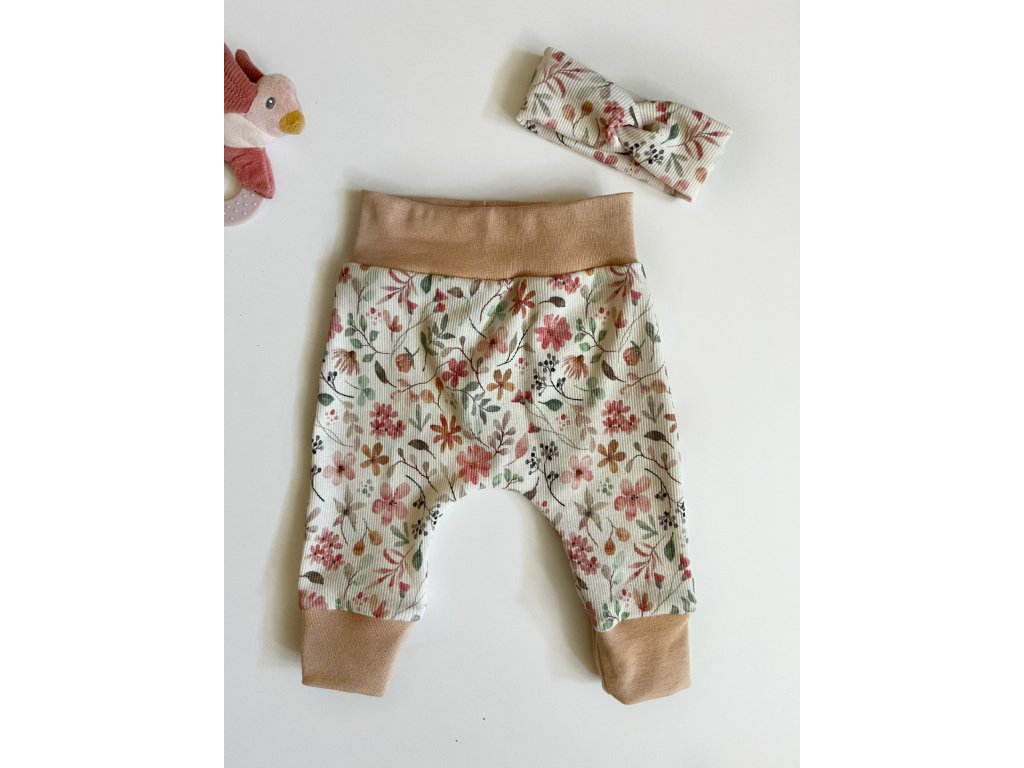 Rostoucí tepláčky s čepičkou nebo čelenkou. Z příjemného bavlněného úpletu. Miminko netlačí přes bříško a neomezují v pohyby. Díky vysokému nápletu a volnému střihu vydrží tepláčky přes více velikostí.